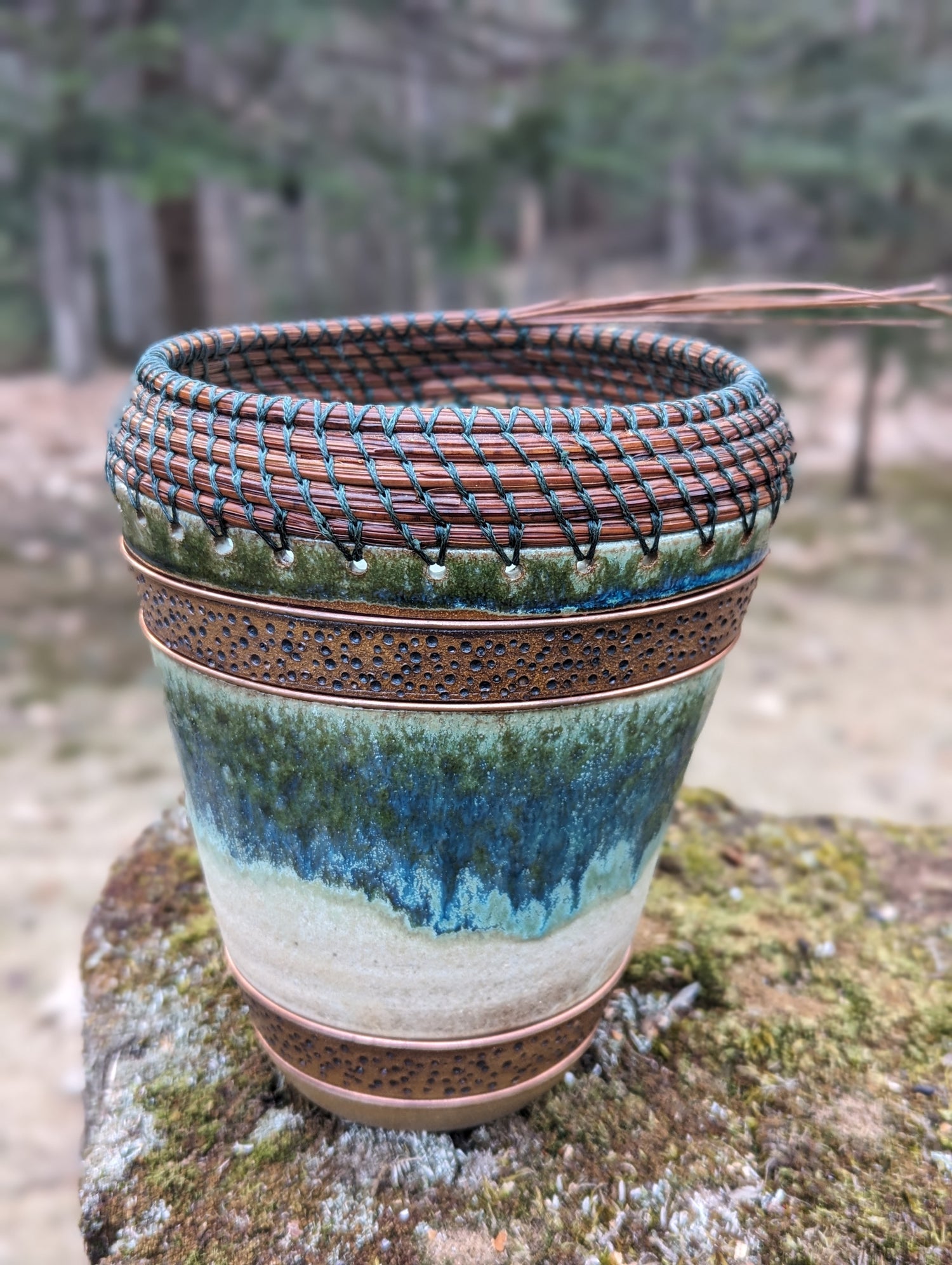 Ceramic Vessel with Pine Needle Coils and Copper Inlay