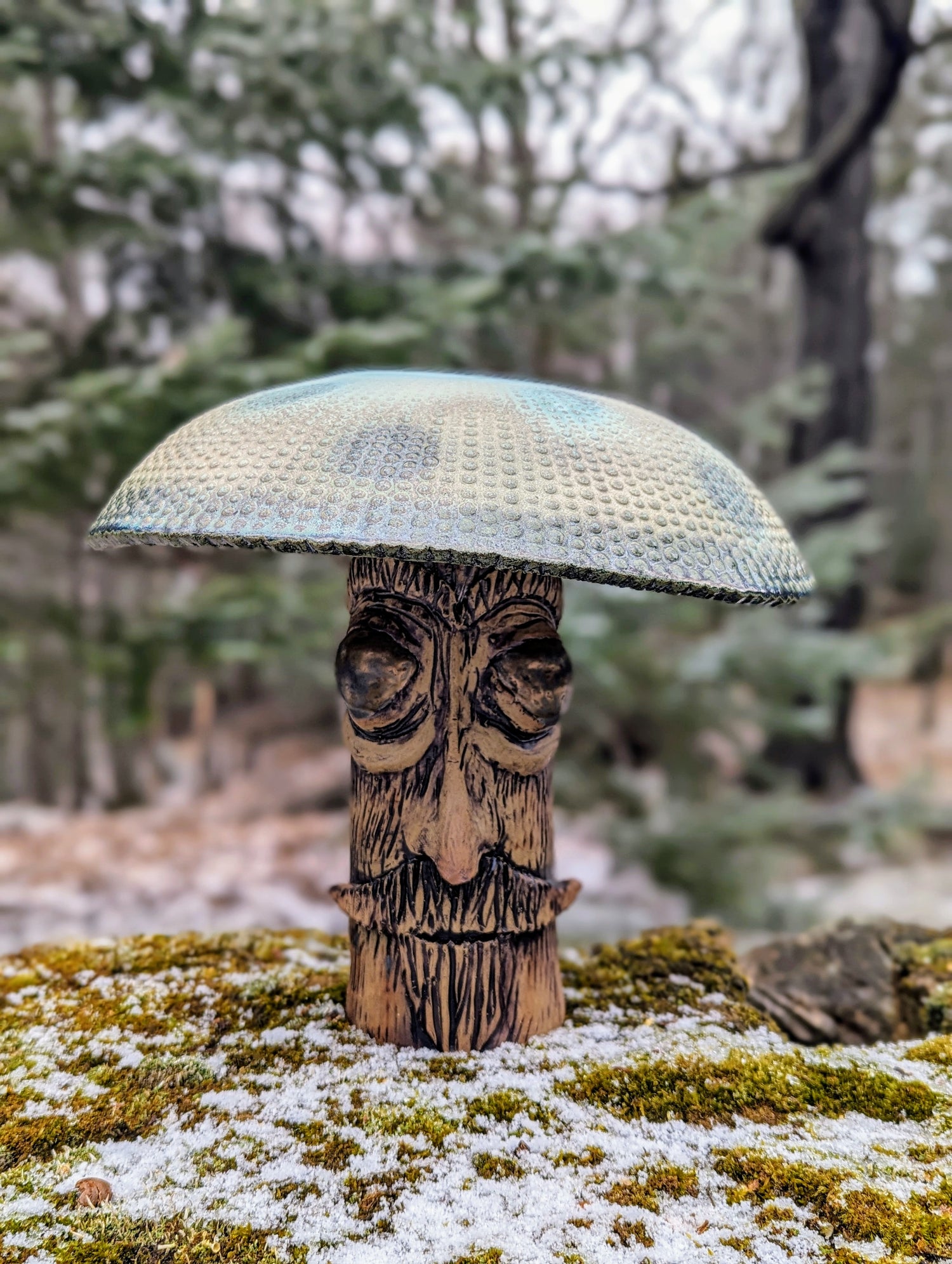 n the enchanted realm of the potter's imagination, where clay takes on a life of its own, a whimsical figure emerges—a Mushroom Man, born from the playful dance of earth and fire. With a stem imbued in the rich ochre hues of iron oxide and a cap adorned in subtle shades of greys and greens, he stands as a testament to the magic woven into every creation.