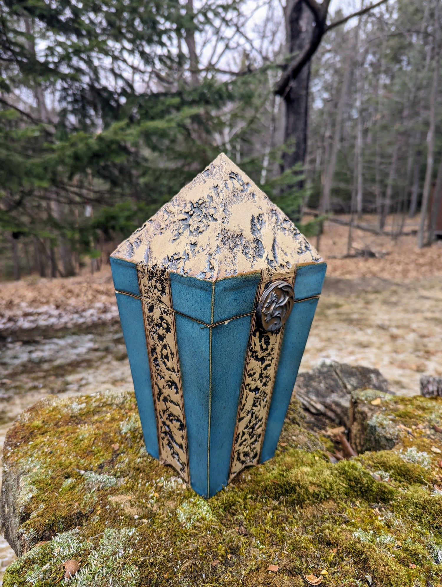 But it is not merely metal that adorns this vessel; a crown of hand-woven pine needle coils adorns its summit, a homage to nature's intricate beauty. Each coil, meticulously crafted, speaks of the artisan's reverence for the forest's silent wisdom, weaving tales of renewal and resilience into the vessel's very essence.